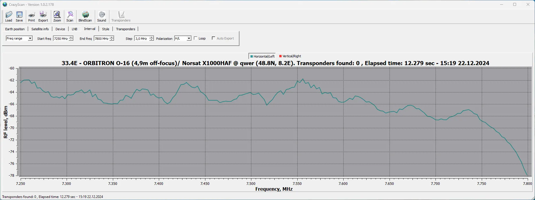 October 5, 2024 at 10:31 AM #2 ...I´m trying to find a small peak at this "fast" inclined satellite...past throug "zero point" today... with inclination 0.03°north to 0.22°south during few minutes of my scan...Nothing visible here.