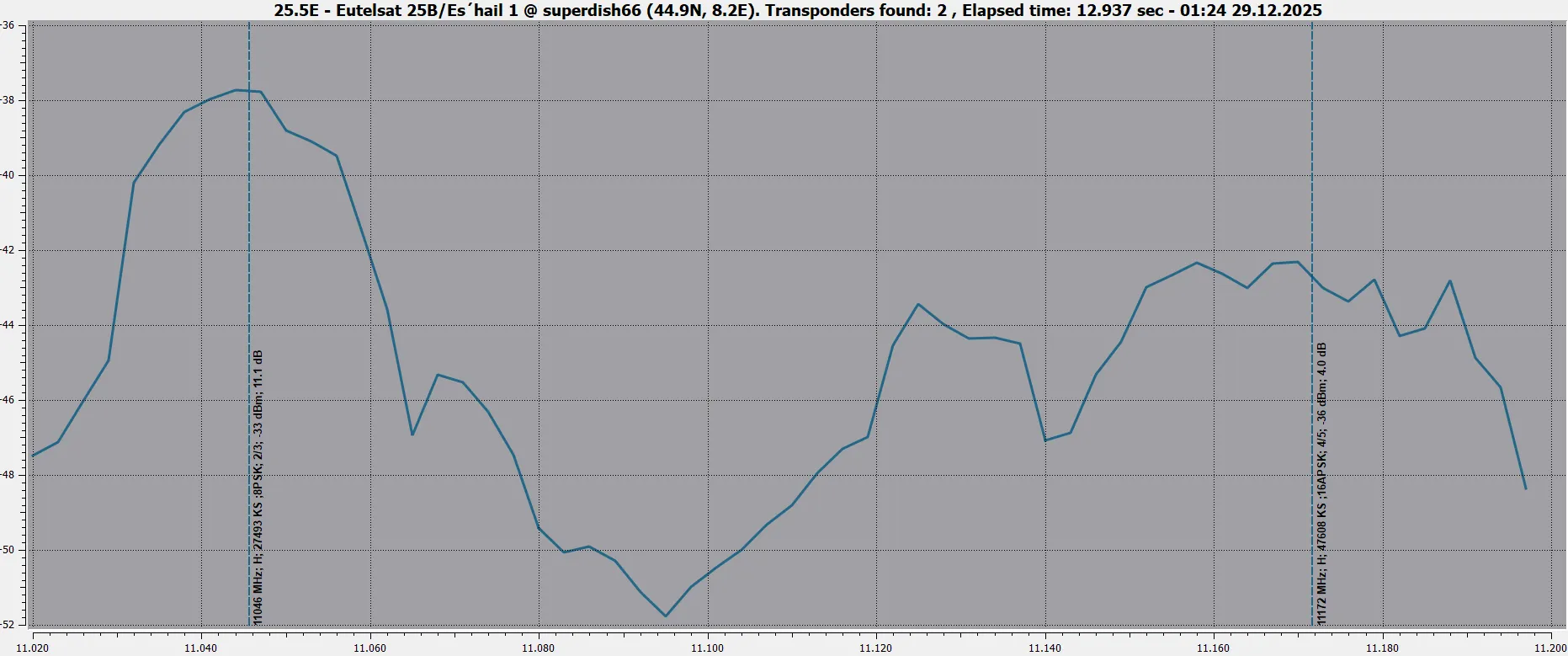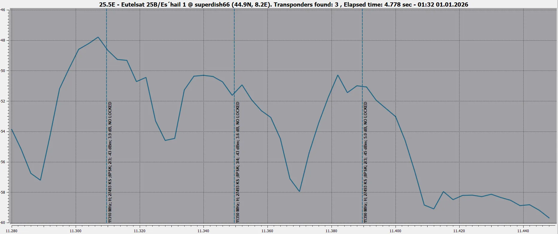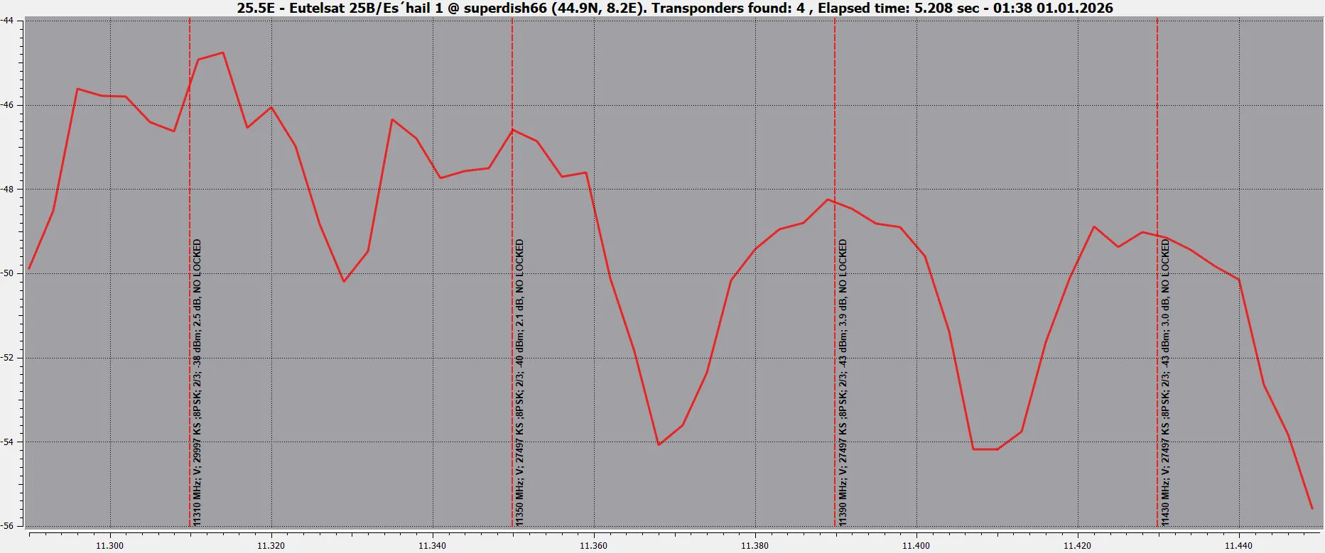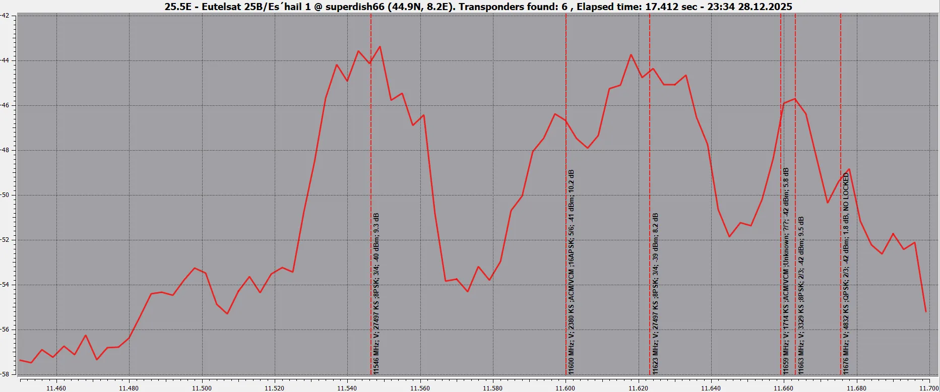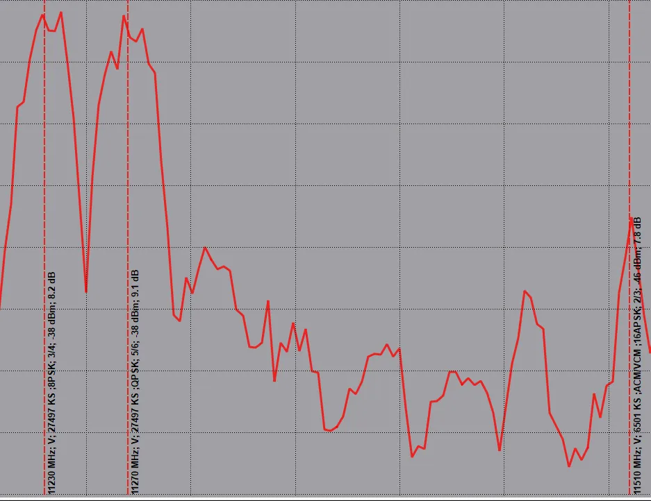 11230 V 27500 DVB-S2 8PSK - Very hard from here. 8.2dB for lock and not stable picture